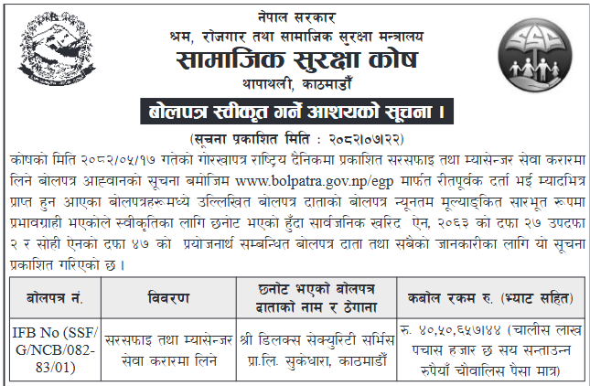 बोलपत्र स्वीकृत गर्ने आशयको सूचना !!!
