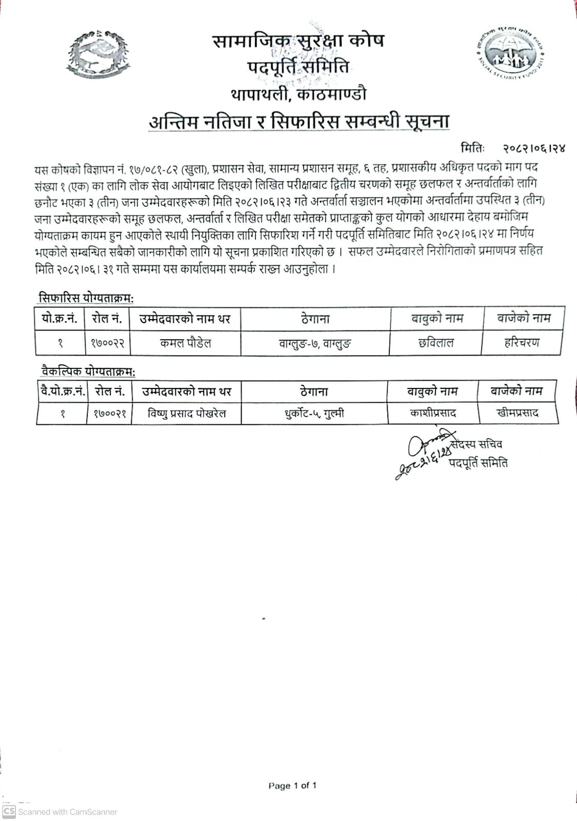 अन्तिम नतिजा र सिफारिस सम्बन्धी सूचना (तह - ६,प्रशासकीय अधिकृत ) !!!