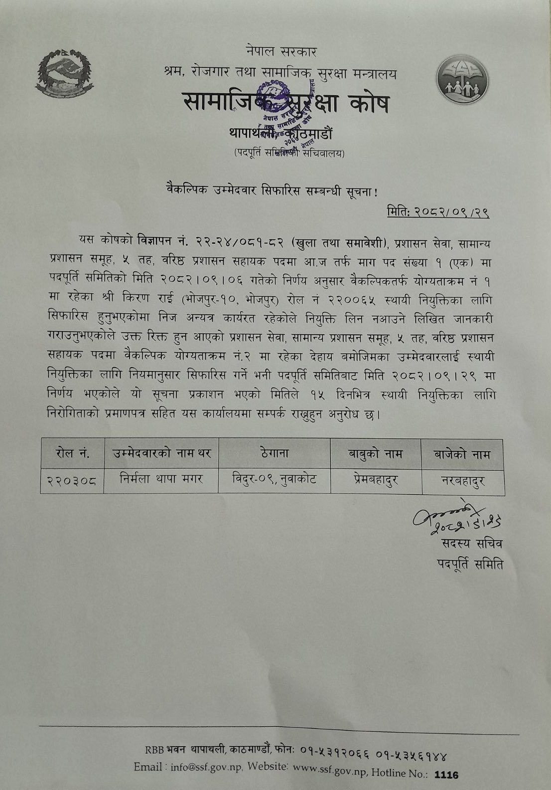 वैकल्पिक उम्मेदवार सिफारिस सम्बन्धी सुचना (तह-५) !!!
